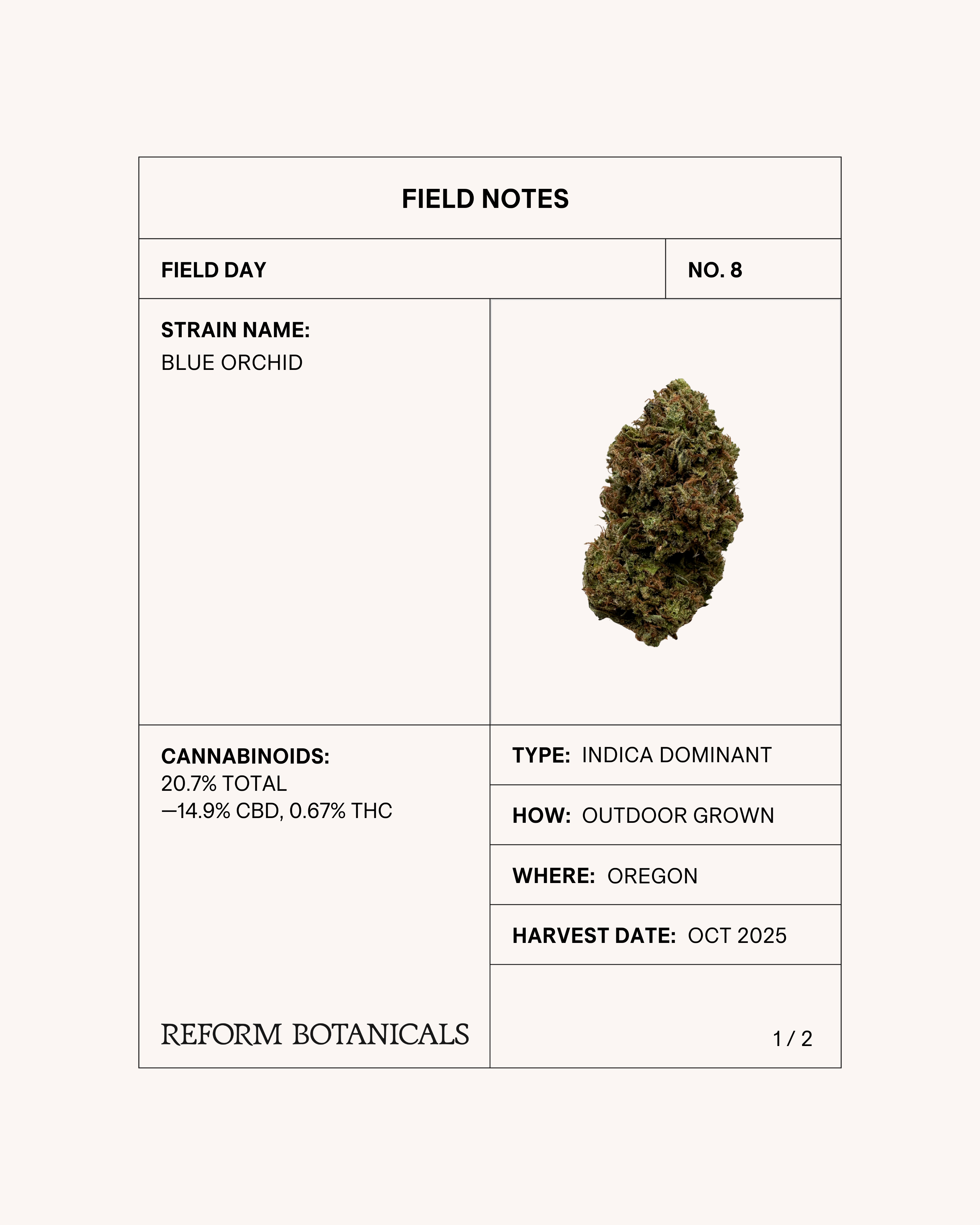 BLUE ORCHID is a full-spectrum CBD flower that is outdoor-grown on a family-owned farm in Oregon. She's sustainably grown with certified organic inputs, hand-harvested, and trimmed for an elevated smoking experience.