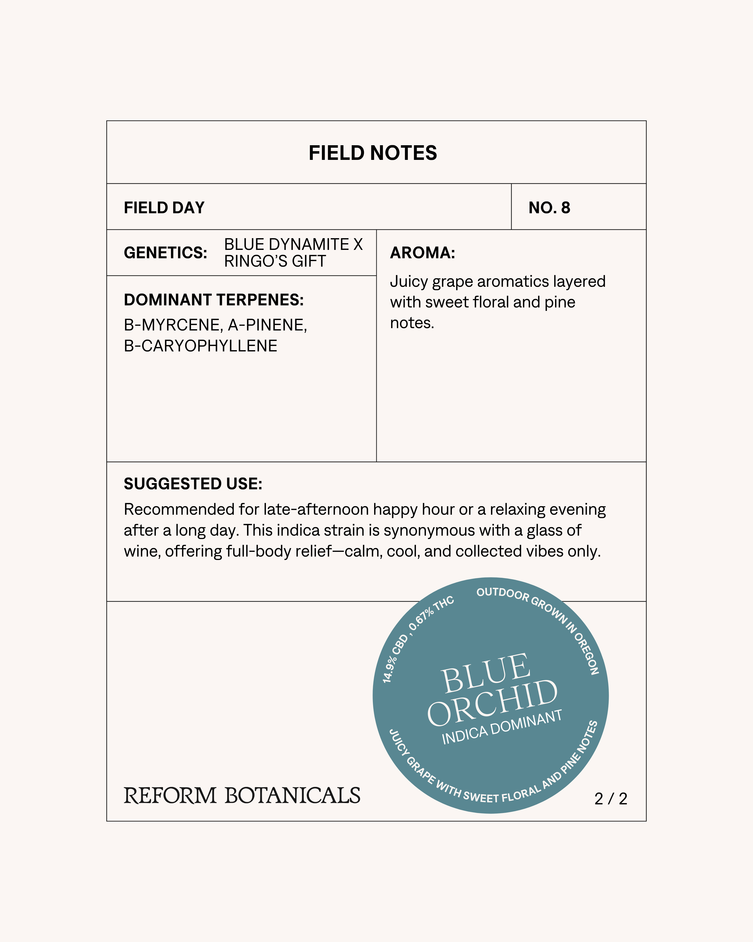 Recommended for late-afternoon happy hour or a relaxing evening after a long day. This indica strain is synonymous with a glass of wine, offering full-body relief—calm, cool, and collected vibes only.